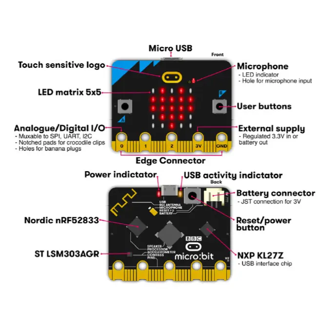 Il computer tascabile che sta cambiando il mondo. Ecco il nuovo micro:bit v2, ora con un microfono e altoparlante aggiunto per l'apprendimento audio fin da subito. L'hardware include anche un numero di upgrade tecnici per garantire che in futuro il dispositivo rimanga uno strumento ideale per esplorare, comprendere e sperimentare con l'intelligenza artificiale e il machine learning, man mano che queste tecnologie iniziano a trasformare il pianeta. Il nuovo micro:bit continua a supportare tutte le stesse funzioni che studenti e insegnanti hanno avuto modo di apprezzare, mentre tutte le lezioni e il codice esistenti per il micro:bit originale saranno compatibili con la versione nuova.