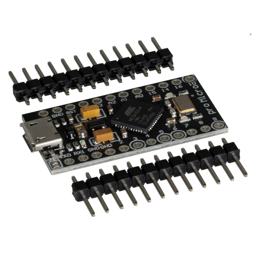 Arduino compatibile Atmel AVR ATmega32U4 The Pro-Micro is an Arduino compatible microcontroller equipped with an Atmel AVR ATmega32U4 microcontroller. The bootloader for use with the Arduino IDE is already written on the microcontroller. By closing the solder bridge J1, the voltage converter on the board is bypassed and the board is directly supplied via the microUSB voltage or the VCC pin. This allows operation from 2.7 V to 5.5 V. The logic level of the module then also corresponds to the supply voltage.