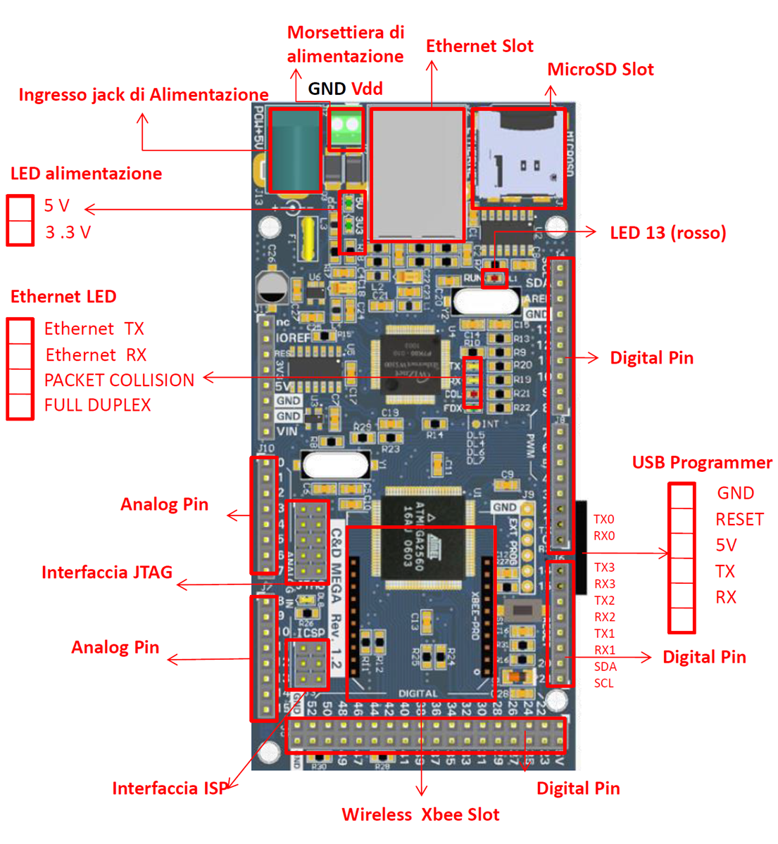 - Pin riservati per Ethernet e SDCard: dal 50 al 52 usato per SPI, 43 usato per SD card