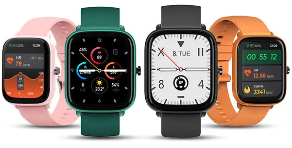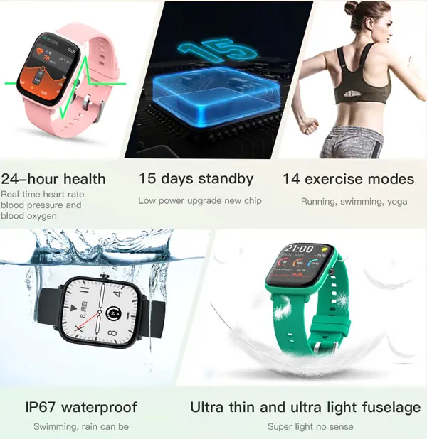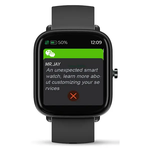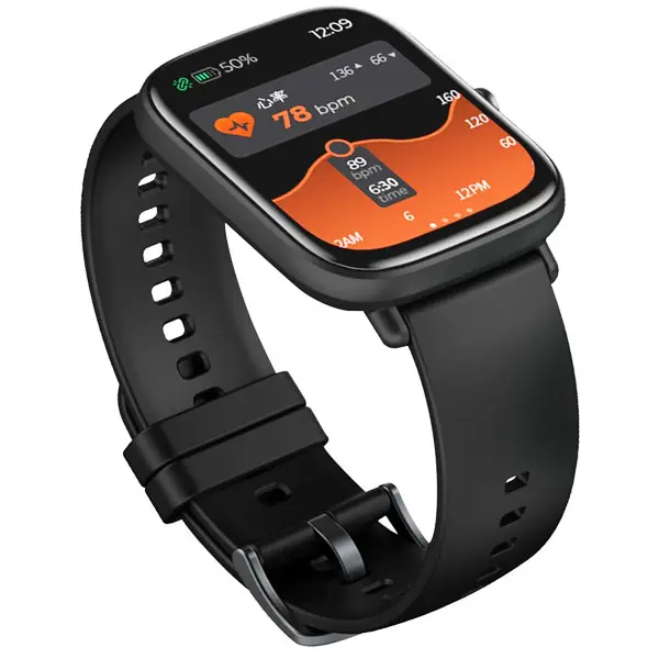 SmartWatch con schermo touch screen a colori da 1,69 pollici, processore RTL 8762C, sensore di movimento, connessione bluetooth, batteria interna ricaricabile, grado di protezione IP67, cinturino in silicone nero.