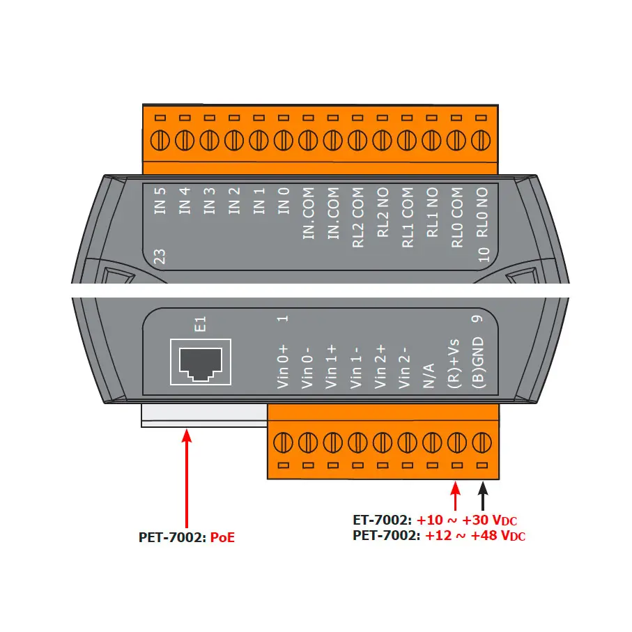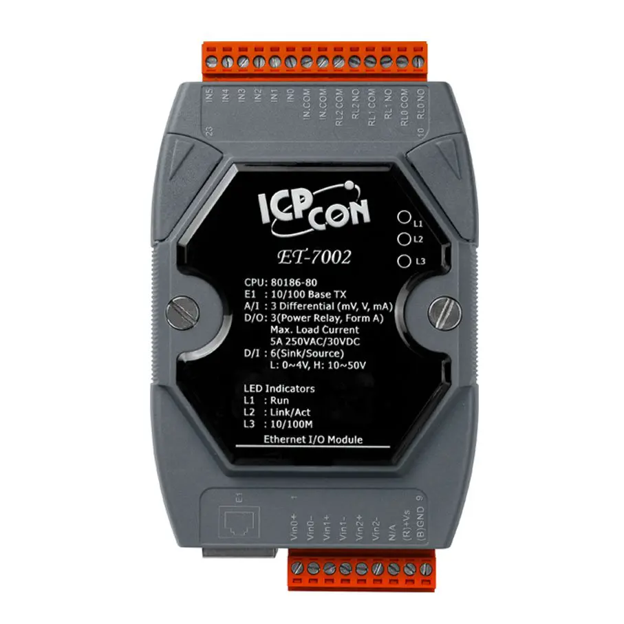 The ET-7002/PET-7002/ET-7202/PET-7202 is a multi-function module with 3-channel analog inputs, 6-channel digital inputs and 3-channel relay
