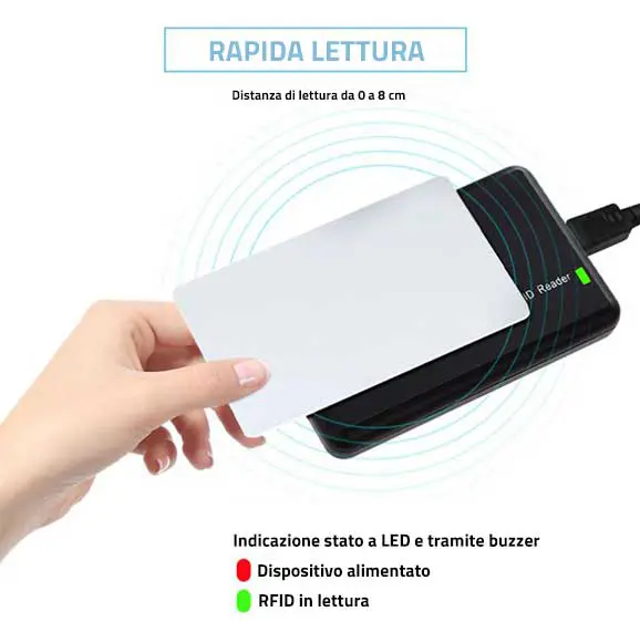 Basta collegarlo a una porta USB, aprire un file di testo o un’applicazione con campo di scrittura attivo, e il codice della tessera verrà immediatamente digitato nel punto in cui si trova il cursore. È perfetto per sistemi di controllo accessi, registrazione presenze, identificazione utenti o progetti di automazione personalizzati.