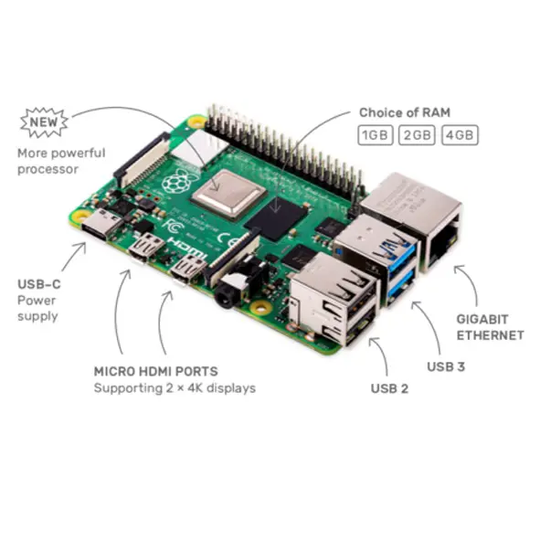Processore Broadcom BCM2711, quad-core 64-bit ARM Cortex-A72 a 1,5 GHz(prende il posto del Broadcom BCM2837B0, quad core Cortex-A53 a 1,4GHz del Raspberry Pi 3 Model A+/B+). Il processore è sempre di tipo fanless, ma è circa tre volte più potente rispetto a quello dei precedenti modelli. Dotazione di memoria RAM: 1, 2,4 o 8 GB LPDDR4-2400 SDRAM (erano 512MB per Pi 3 Model A+ e 1GB per Pi 3 Model B+)