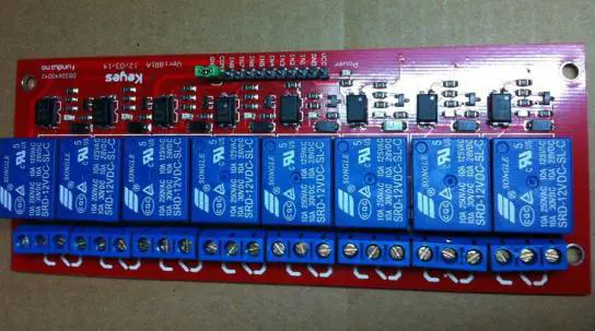 If you want to switch up to 8 high current / high voltage loads from a microcontroller, this 5V relay board can do it.