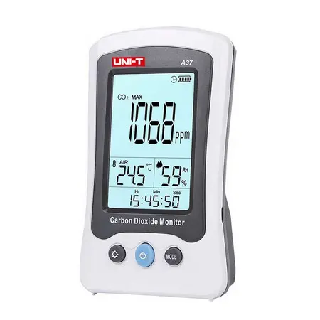 LCD display- allame sonoro e visuale UNI-T A37 CO2 Meter A37 è utilizzato per monitorare il livello di CO2 (diossido di carbonio) negli ambienti interni. Il display LCD mostra la concentrazione di CO2 in PPM, temperatura ed umidità. La qualità dell'aria è indicata anche da simboli emoticons.Quando la concentrazione di CO2 supera il livello di comfort, si attivano gli allarmi audio e visuale.