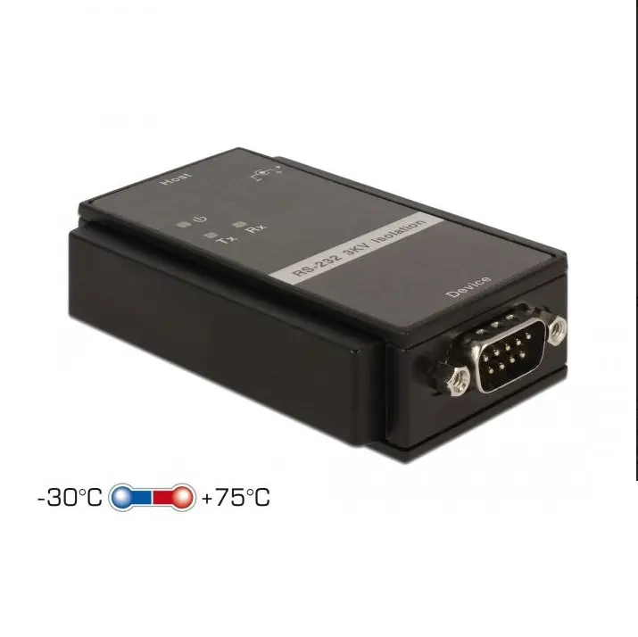 DELOCK OPTOISOLATO GUIDA DIN+ALIMENT. This RS-232 to RS-232 isolator by Delock is designed to protect the connected components from electrostatic discharges and power surge. In addition, the galvanic isolation avoids data transmission errors by uneven ground voltages. Power can be provided through the serial interface or the included power supply. DIN rail mounting is supported. Specification • Connector: Host: 1 x Sub-D 9 pin Serial RS-232 female Device: 1 x Sub-D 9 pin Serial RS-232 male 1 x DC 1.3 x 3.5 mm female • Data transfer rate up to 1 Mbps • Data Bit: 5, 6, 7, 8 • Stopp Bit: 1, 1.5, 2 • Parity: None, Even, Odd, Space, Mark • Signals: TXD, RXD, CTS, RTS, DCD, DTR • LED indicators for status TX / RX and power supply • Galvanic isolation 3 kV (optical isolation) • 600 W power surge for the RS-232 interfaces • 600 W power surge at the DC Connector • ± 15 kV ESD protection for all signal pins • Power supply RS-232 interface pin 9: 12 V • Power supply: 10 - 30 V • Power consumption: ca. 50 mA • Operating temperature: - 30 °C ~ 75 °C • Relative humidity: 5 ~ 95 % (not condensing) • Storage temperature: - 40 °C ~ 85 °C • Housing material: plastic • Dimensions (LxWxH): ca. 88 x 54 x 22 mm • Accessories for mounting on 35 mm DIN rails