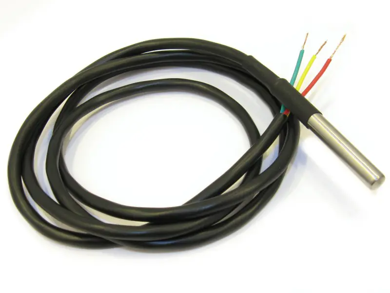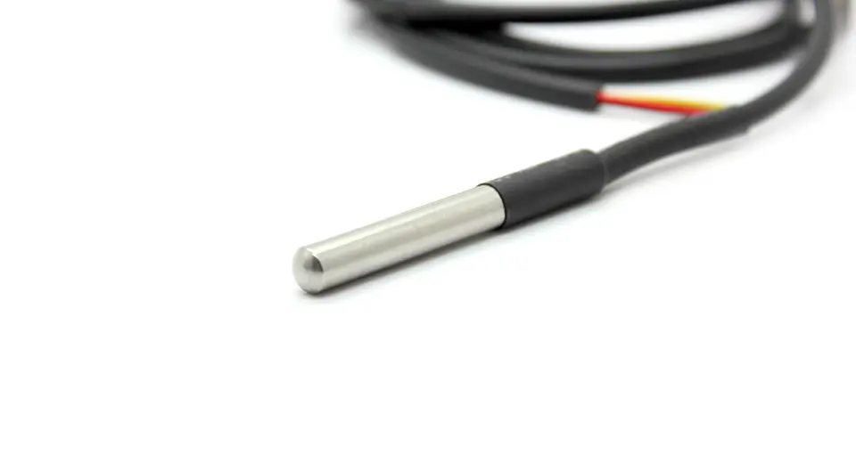 Sonda di temperatura waterproof in acciaio inossidabile, realizzata con il sensore digitale di temperatura DS18B20 della Maxim. Consente di misurare con precisione la temperatura (da -55°C a +125°C) in ambienti umidi. Ogni sensore è dotato di un codice seriale a 64-bit memorizzato al suo interno, questo consente di utilizzare un enorme numero di sensori su un bus dati. Le applicazioni comprendono controlli termostatici, sistemi industriali, prodotti di consumo, termometri, etc.