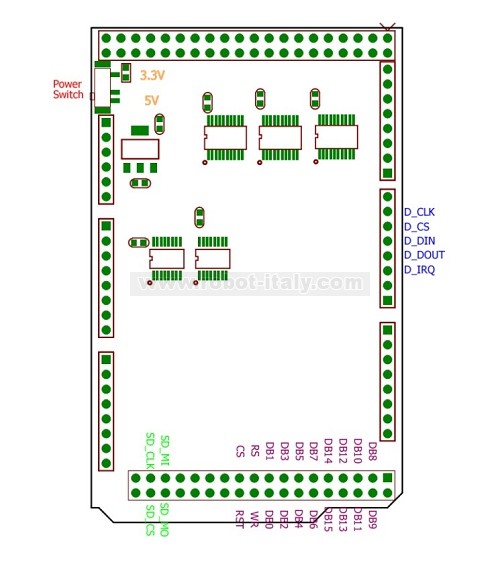 Questo shield permette di connettere uno schermo TFT LCD serie ITDB02 alla board arduino MEGA e i pin-out corrispondono a quelli utilizzati nella library TFT.