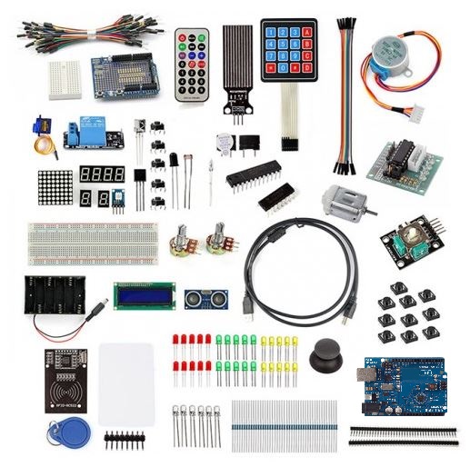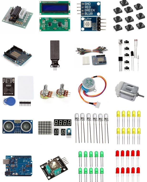 1x Atmega328 UNO R3 board 1x Prototype Shield 1x Mini Breadboard 1x 1602LCD 1x USB Cable 2x Buzzer 2x 7 Segment LED Numeric Displays 1x 4 Digit 7 Segment LED Display Module 1x 74HC595 Chip 1x Infrared Remote Control 1x Photoresistor 1x 5K Potentiometer 1x 10K Potentiometer 1x MAX7219 LED Display IC 5x Small Push-buttons 10x Big Push-buttons 10x Red LED 10x Green LED 10x Yellow LED 5X RGB LED 1xTilt sensor 1x940nm infrared LED 1x RGB Model 1x DC Motor 1x 5V stepper motor 1x stepper motor driver test model 1x water sensor model 1x Flame Sensor 1x LM35 temperature sensor 1x VS1838B Universal Infrared Receiving Head 1x 830 tie point Breadboard 1x Micro servo 9G SG90 1x HC-SR04 Ultrasonic Distance Sensor 1x Sainsmart opto-couple 1 channel relay 1x 4 x 4 Matrix Array 16 Key Membrane Switch Keypad 1x 2.54mm Straight 40 Pin Header 1x 2.54mm Elbow 40 Pin Header 10x Dupont Lines(Female to Female) 1x Arduino joystick25x Jumper wires 5x 1K Resistors 20x 10K Resistors 20x 220 Resistors 1x DC 9v Battery Box including the cable 1x 8*8 Dot Matrix Display 1x SainSmart RFID-RC522 module 1x The standard S50 blank IC card 1x S50 special-shaped card (as shown by the key ring shape) 1x Straight, curved rows of pin of the article 1x Cell Box