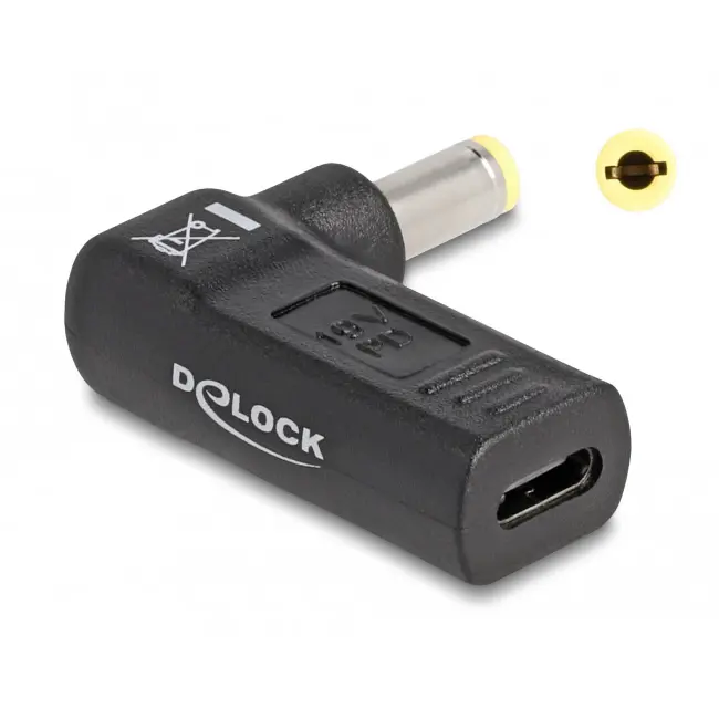 Con questo adattatore Delock è possibile utilizzare un cavo USB Type-C™ per ricaricare un portatile. L'angolo di 90° evita che il cavo si pieghi e grazie alle dimensioni ridotte, l'adattatore è un compagno di viaggio ideale.