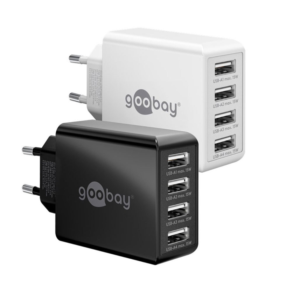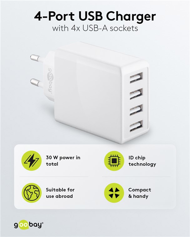 Il caricatore USB di Goobay è dotato di 4 porte USB-A per caricare fino a 4 dispositivi contemporaneamente. L'alimentatore USB multiplo ha un riconoscimento intelligente della carica (ID Chip Technology) che controlla in modo ottimale la corrente di carica. La spina di ricarica USB può essere utilizzata universalmente ed è compatibile con smartphone come Apple, Samsung, Xiaomi, LG, Huawei, nonché con tablet come Apple iPad e batterie esterne. L'elettronica di protezione integrata nella spina USB protegge i dispositivi collegati da sovracorrente, sovraccarico e surriscaldamento. Grazie al suo design compatto, l'adattatore USB si adatta a qualsiasi sacca e diventa il compagno di viaggio ideale. Grazie all'intervallo di tensione di ingresso di 100-240 V, l'alimentatore USB di Goobay può essere utilizzato anche all'estero.