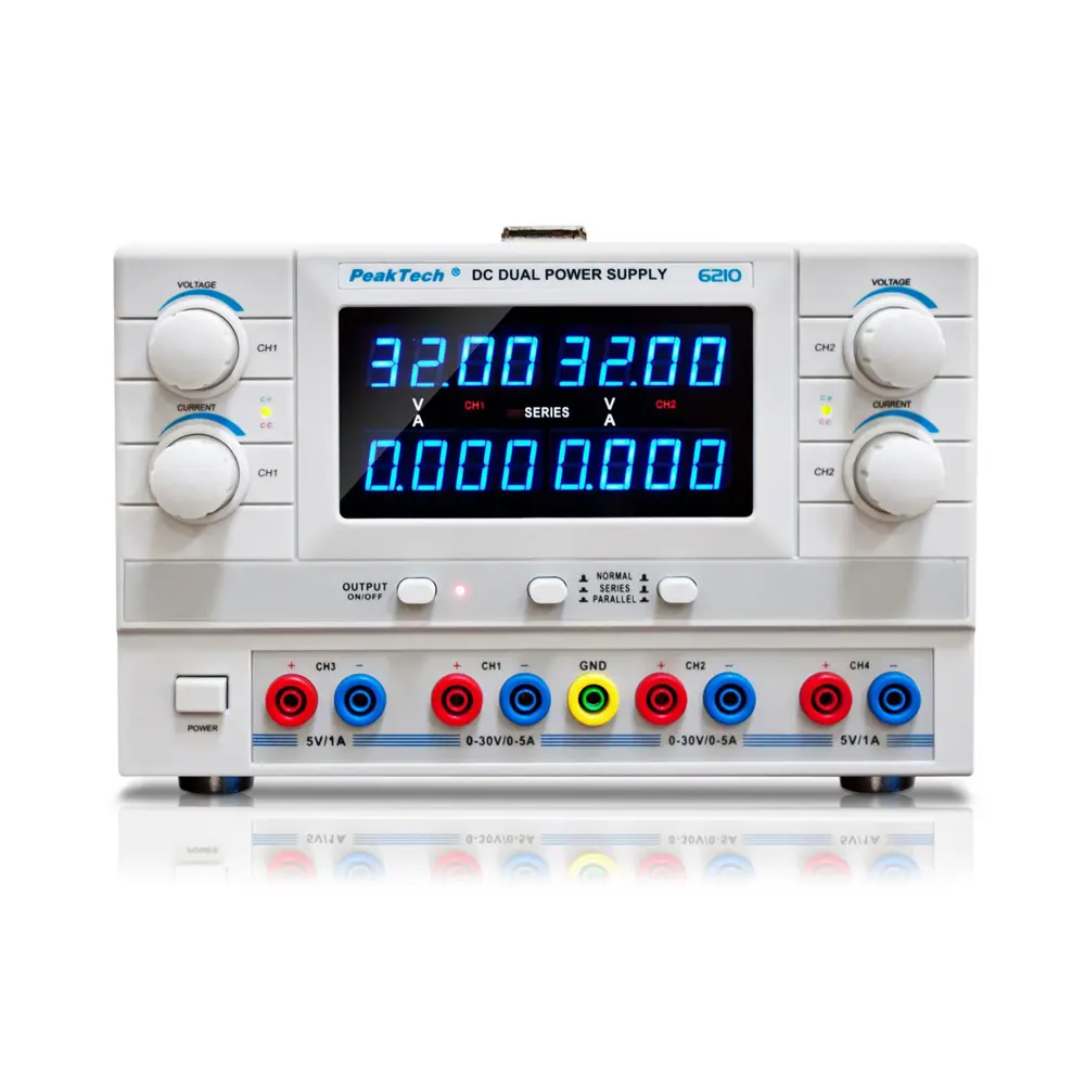 DUAL 0~30 Vdc - 0 ~ 5A + 2x 5Vdc 1A Questa nuova serie di alimentatori da laboratorio a regolazione lineare, dal design moderno e dalla tecnologia più recente, con display a LED blu per i valori di tensione e corrente per una lettura rapida e precisa. È disponibile come versione a uno, due o quattro canali. L'uscita di tensione e la limitazione di corrente sono regolabili in continuo per i canali principali e possono essere commutati indipendentemente l'uno dall'altro, in serie o in parallelo. In questo modo, con uscite commutate in serie, la tensione di uscita massima è di 60 V DC; con uscite commutate in parallelo la corrente di uscita max. Raddoppia a 10 A DC. Grazie alla facilità d'uso e alle elevate prestazioni si possono utilizzare in modo universale nella ricerca, nello sviluppo, nell'industria elettrica o nel settore della formazione.