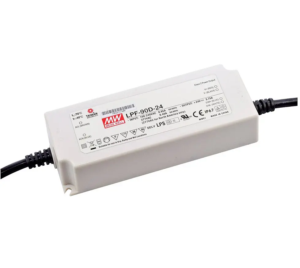 Alimentatore/driver per LED da 90 W a tensione costante di 24V, impermeabile IP67 con ingresso c.a. universale. Questi alimentatori/driver per LED completamente incapsulati, impermeabili IP67 incorporano una funzione PFC attiva e dispongono di un contenitore in plastica completamente isolato. Le applicazioni adatte per questi alimentatori/driver per LED con indice di protezione IP67 includono l'illuminazione a LED e le applicazioni mobili; inoltre, si possono utilizzare negli ambienti asciutti, umidi o bagnati.