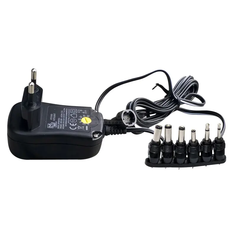 6 PLUG -PROTEZIONE CC/SOVRATENSIONE/TEMP Plug-in switching power supply with europlug • Universal input • Protections: short circuit/over load • Insulation Class II • Low no load power consumption • Energy efficiency level VI • Safety standards: EN62368-1 • EMC standards: EN61204-3 • DC output voltage detachable via six single plug-in adapters: Jack plug: 2,5mm; 3,5mm Hollow plug: 5,0x2,1mm; 5,5x2,5mm; 3,5x1,35mm; 5,5x1,5mm