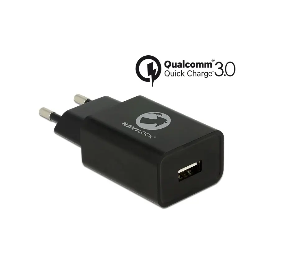 This Navilock USB power supply can be used to charge one USB device. With Qualcomm® Quick Charge™ 3.0 technology, supported devices can be charged up to 75% faster. Other USB devices can be charged with up to 1.5 A at 5 V.