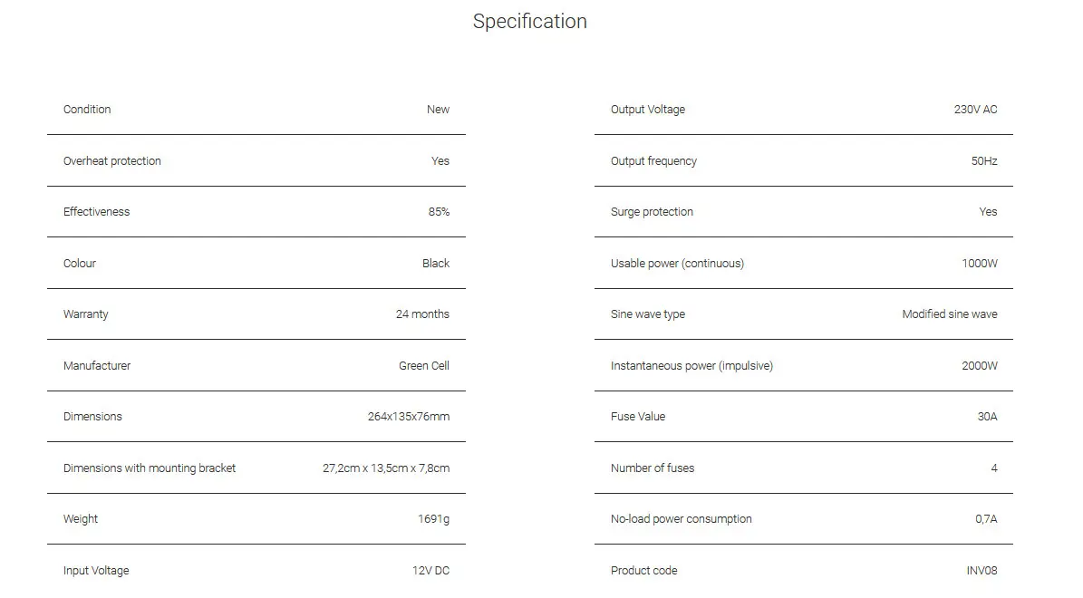 Stay connected - Car inverter is a device that allows you to use electronic devices wherever you are, even when away from the power source Versale and adaptable - Green Cell inverter is not only equipted in sockets to which you can connect electrical devices, but it also has a USB port suitable to charge smaller gadgets such as a smartphone or a tablet Safety at all times - our Green Cell inverter has a number of protections and certifications against overvoltaging, to make sure your devices not only run smoothly but also assures safety Modified sine wave - it involves a simpler converter construction, which ensures lower failure rate. The inverter with modified sine wave allows for stable operation of devices such as power supplies, computers, LED lamps