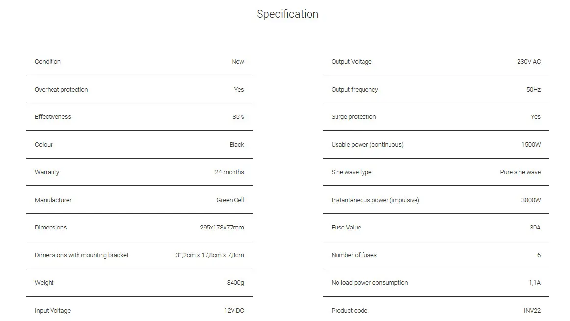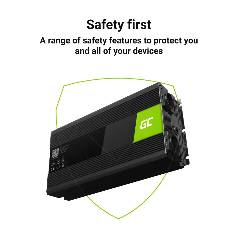 Stay connected - Car inverter is a device that allows you to use electronic devices wherever you are, even when away from the power source Versale and adaptable - Green Cell inverter is not only equipted in sockets to which you can connect electrical devices, but it also has a USB port suitable to charge smaller gadgets such as a smartphone or a tablet Safety at all times - our Green Cell inverter has a number of protections and certifications against overvoltaging, to make sure your devices not only run smoothly but also assures safety Pure sine wave - works perfectly with devices that require continuous power supply identical to the one in the socket. These include laptops, refrigerators, TV sets and the most sensitive ones - solar panels, stoves and central heating pumps