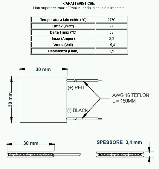 Cella di PELTIER 27W a 12 volt. Corrente massima assorbita di 3,2 ampère. Differenziale massimo fra le temperature lato caldo e lato freddo di 68 °C. Tensione massima di alimentazione 15,4 volt. Potenza frigorifera massima di 27 watt con temperatura sul lato caldo stabilizzata a 27 °C. Peso 14 grammi.