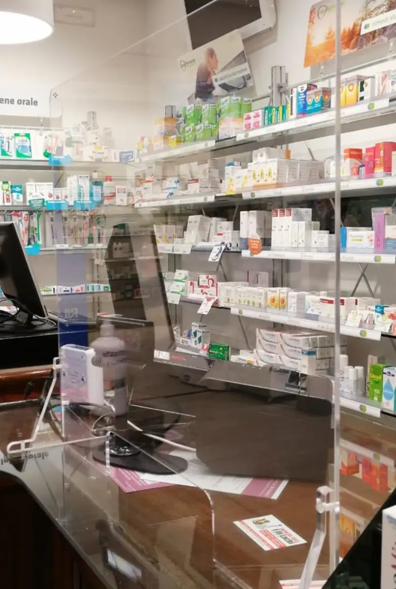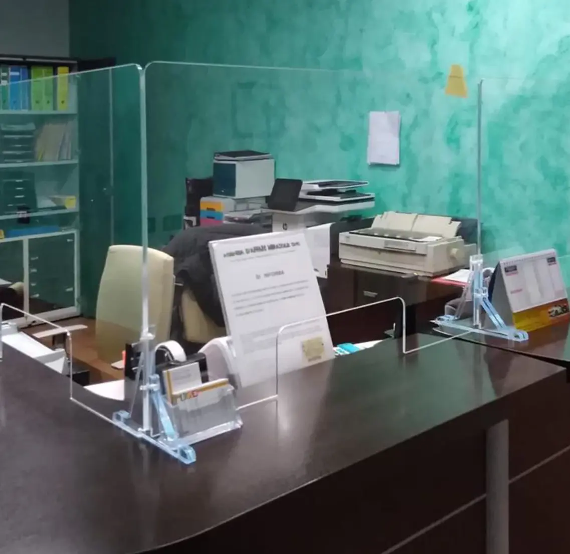 Dispositivo di distanziamento e protezione da tavolo in metacrilato trasparente.