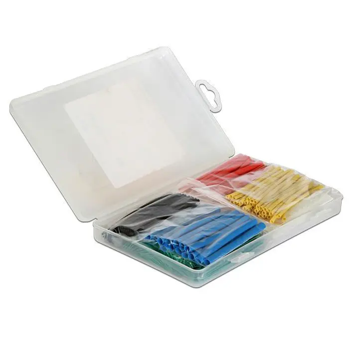 Specification • Tube length ca. 100 mm • Content: 80 x diameter 1.5 mm black 40 x diameter 2.5 mm yellow 25 x diameter 4.0 mm red 15 x diameter 6.0 mm blue 40 x diameter 10.0 mm green (2 x poly bags with each 20 pieces) 30 x diameter 13.0 mm white • Shrinkage ratio 2:1 • Shrinking temperature: 100 °C ~ 125 °C • Box dimensions (LxWxH): ca. 255 x 160 x 35 mm