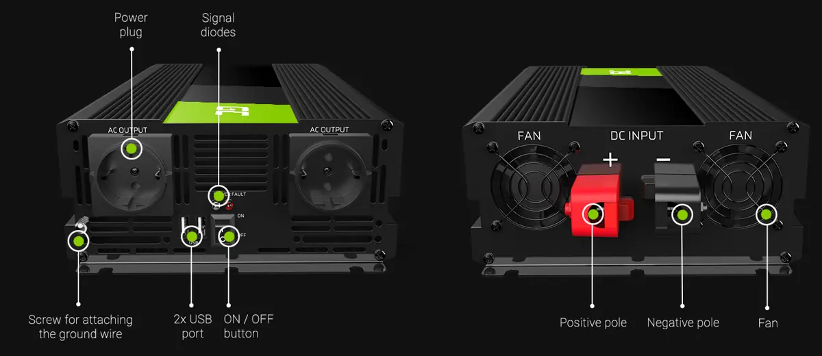Versale and adaptable - Green Cell inverter is not only equipted in sockets to which you can connect electrical devices, but it also has a USB port suitable to charge smaller gadgets such as a smartphone or a tablet