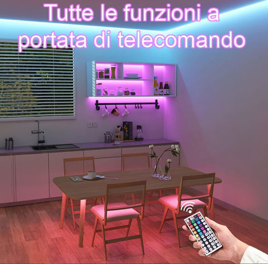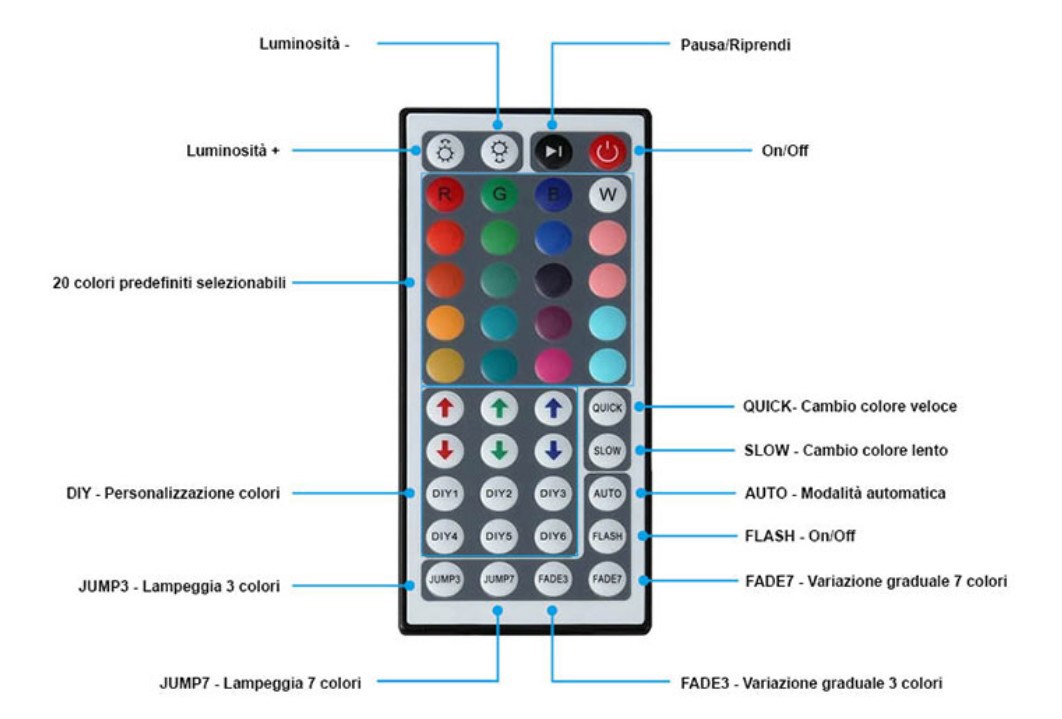 - Telecomando a infrarossi con 44 tasti, inclusi 6 tasti personalizzabili per memorizzare i colori preferiti e 6 frecce per variare la tonalità del colore (DIY).