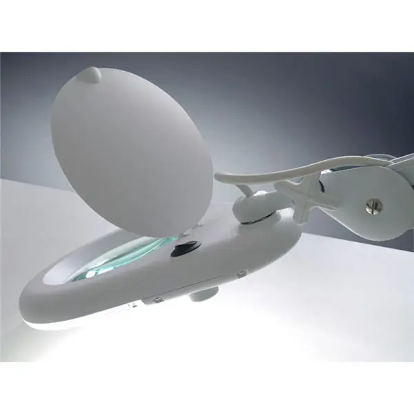 Lente d'ingrandimento a 8 diottrie con lampada costituita da 56 LED bianchi. Dispone di doppio braccio bilanciato a molle ed è facilmente orientabile a seconda delle proprie esigenze. È particolarmente indicata per eseguire lavori di precisione ed è utilissima anche per uso domestico. Fornita di morsetto metallico per il fissaggio al banco. Alimentazione 220 Vac, colore bianco.