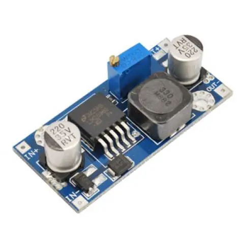 Convertitore DC/DC switching di tipo Step-Down, dalle dimensioni particolarmente ridotte (48,35 x 23,35 x 14 mm), in grado di convertire una tensione continua compresa tra 3 e 40 volt in una tensione di uscita da 1,5 a 35 volt (regolabile tramite trimmer). La massima corrente disponibile è di circa 3 A (di picco).