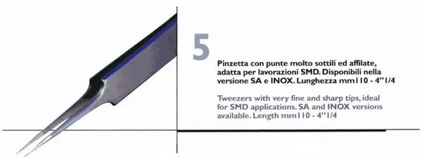 Pinzetta a molla con punte sottili ed affilate. Studiata per lavorazioni SMD. Costruita con materiale antiacido non magnetico (-SA). Lunghezza totale 110 mm.