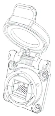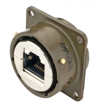 Connettore militare RJ45 industriale IP67 AMPHENOL RJF21BSCC femmina da pannello con tappo Self Closing Cap. Secondo la MIL-C-26482. Conforme alla IEC 60603-7 variant 11. Utilizzabile per trasmissione dati su reti 10 BaseT, 100 BaseTX and 1000 BaseT Cat 5e per TIA/EIA 568B and ClassD per ISO/IEC 11801. Terminazione posteriore con RJ45.
