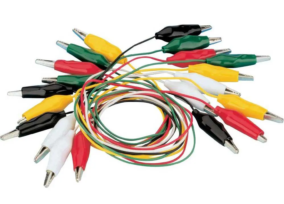 10 cavi con 2 pinzette a coccodrillo isolate cad. (2 x nero, 2 x rosso, 2 x verde, 2 x giallo, 2 x bianco).