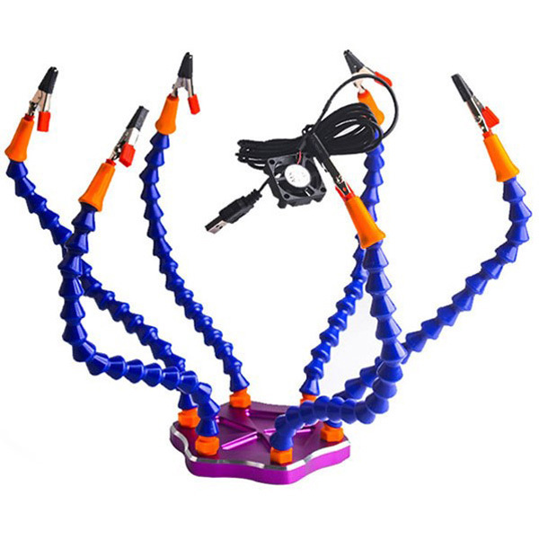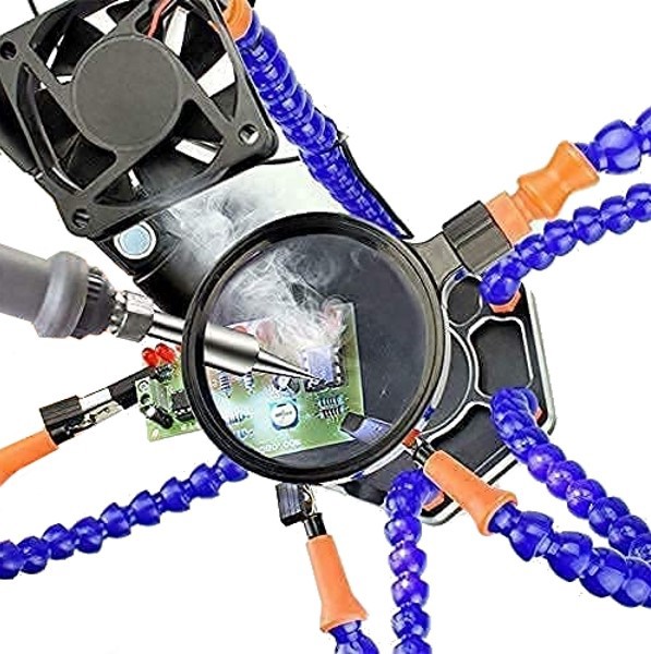 Stazione di lavoro per saldatura composta da 6 bracci flessibili, lente d'ingrandimento 3x, ventola 30×30 con alimentazione USB e 6 clip a coccodrillo. Permette di sorreggere piccoli oggetti e di avere entrambe le mani libere. La ventola consente di assorbire il fumo della saldatura, mentre le clip a coccodrillo e la lente d'ingrandimento orientabile, consentono di realizzare, con estremo confort, lavori di precisione.
