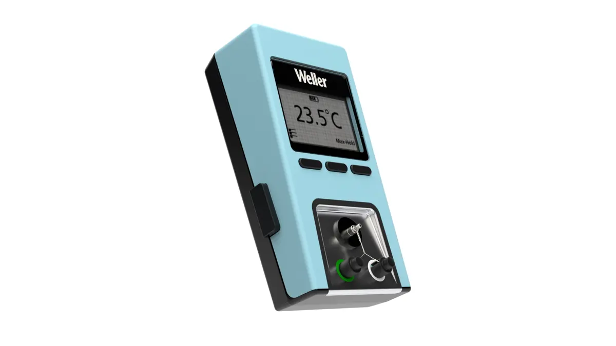 Il dispositivo di misurazione della temperatura ad alta precisione Weller, dal design compatto e alimentato a batteria, può essere facilmente condiviso tra diverse postazioni di lavoro
