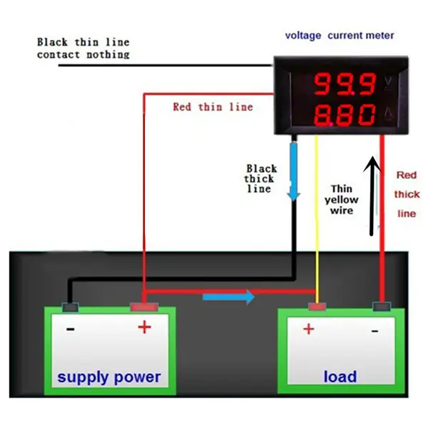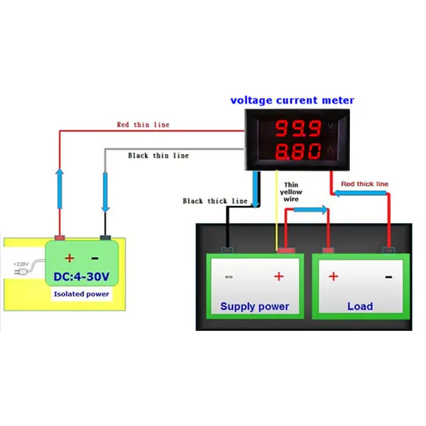 Specifiche tecniche Display: LED rossi altezza numero 0,28" Alimentazione: da 3,5 a 30 Vdc Range di misura: - Tensione: da 0 a 100 Vdc - Corrente: da 0 a 9,99 A Precisione: circa 1% Temperatura di lavoro: da -10°C a +65°C Dimensioni (mm): - massime: 48x29x22 - per foro d'incasso: 45,2x26 Peso: 20 grammi