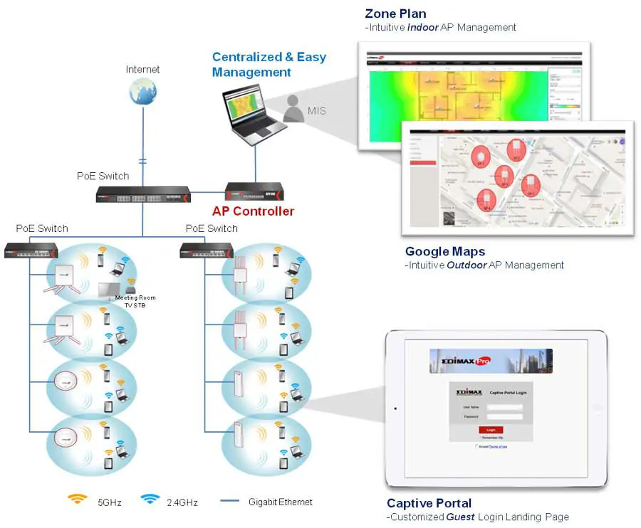 Architettura scalabile: Gestione fino a 32 punti di accesso Edimax Pro, sia interni, sia esterni.