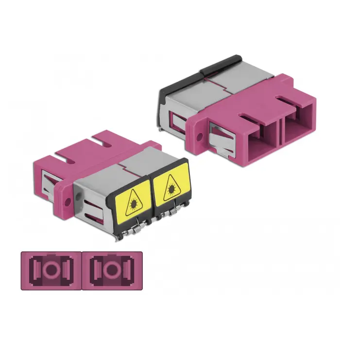 Multimodale OM4 DUPLEX Delock Accoppiatore in fibra ottica con protezione laser flip SC Duplex femmina per SC Duplex femmina multimodale viola Con questo accoppiamento SC Duplex Delock, due connettori maschio in fibra ottica possono essere facilmente collegati tra loro. L'accoppiamento consente un collegamento diretto al cavo in fibra ottica ed è adatto a un semplice montaggio in scatole di connessione in fibra ottica, armadietti e pannelli patch.