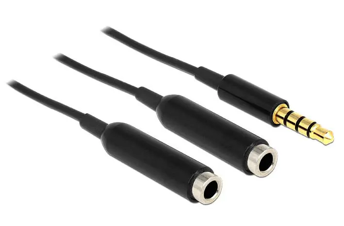This audio stereo jack cable by Delock can be connected to a free stereo jack female port of your iPhone, iPod, iPad etc. in order to get two stereo jack female interfaces. Thus two persons can easily listen to music or similar, through their headphones.