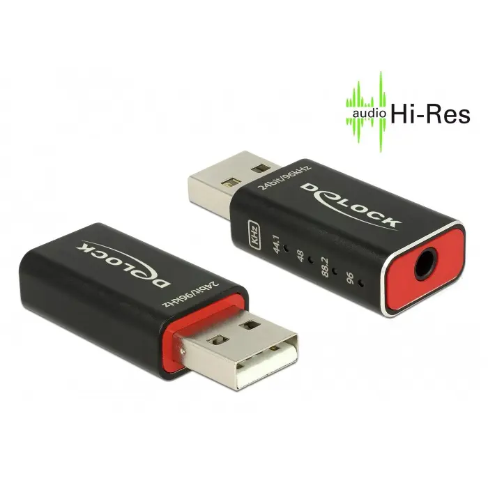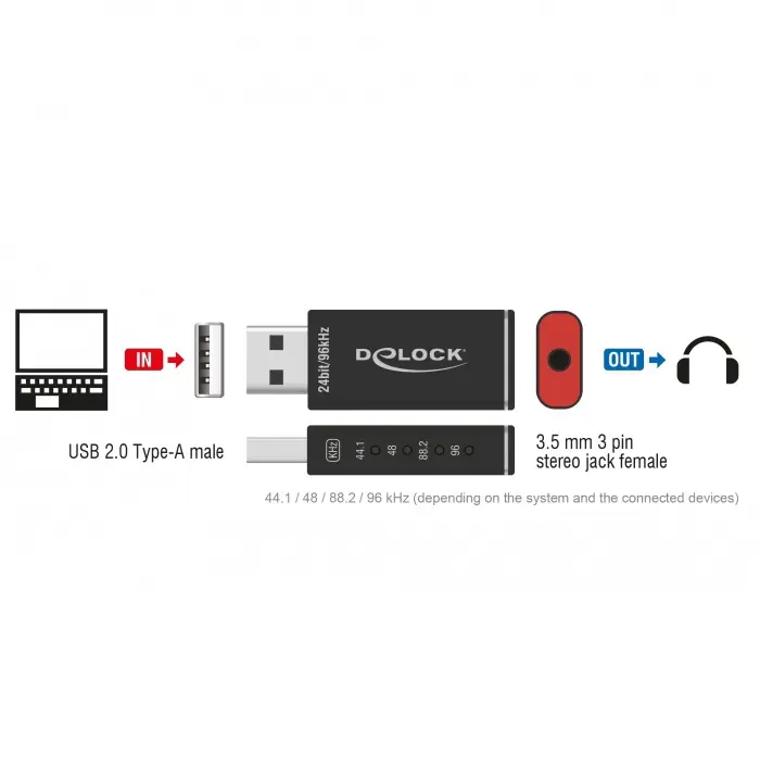 L'adattatore audio USB Delock espande un portatile o un tablet con un'ulteriore scheda audio ad Alta risoluzione. Questo consente di collegare dispositivi quali altoparlanti, cuffie ecc. Le cuffie ad alta intensità di alimentazione funzionano anche con l'adattatore. Utilizzando un adattatore OTG Micro USB maschio o USB Type-C™ maschio per USB-A femmina, l'adattatore audio può essere collegato a un dispositivo Android.