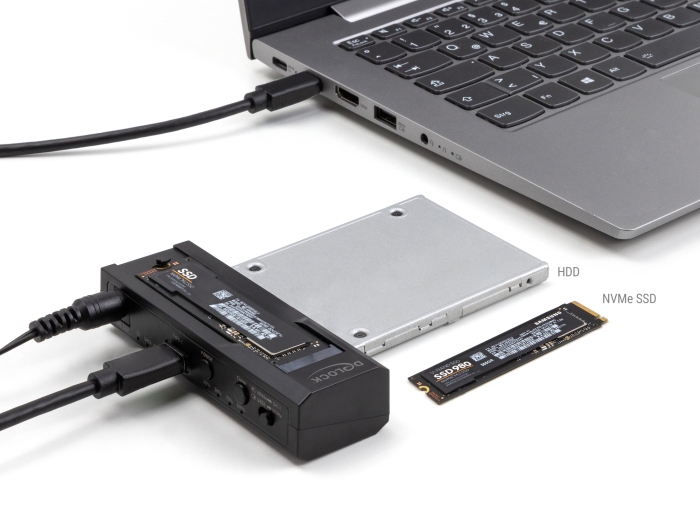 Questo convertitore Delock consente il funzionamento simultaneo di un SSD M.2 NVMe, in formato 2280, 2260, 2242 e 2230 e di un HDD o SSD SATA da 2.5" o 3.5" tramite l'interfaccia USB.