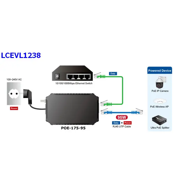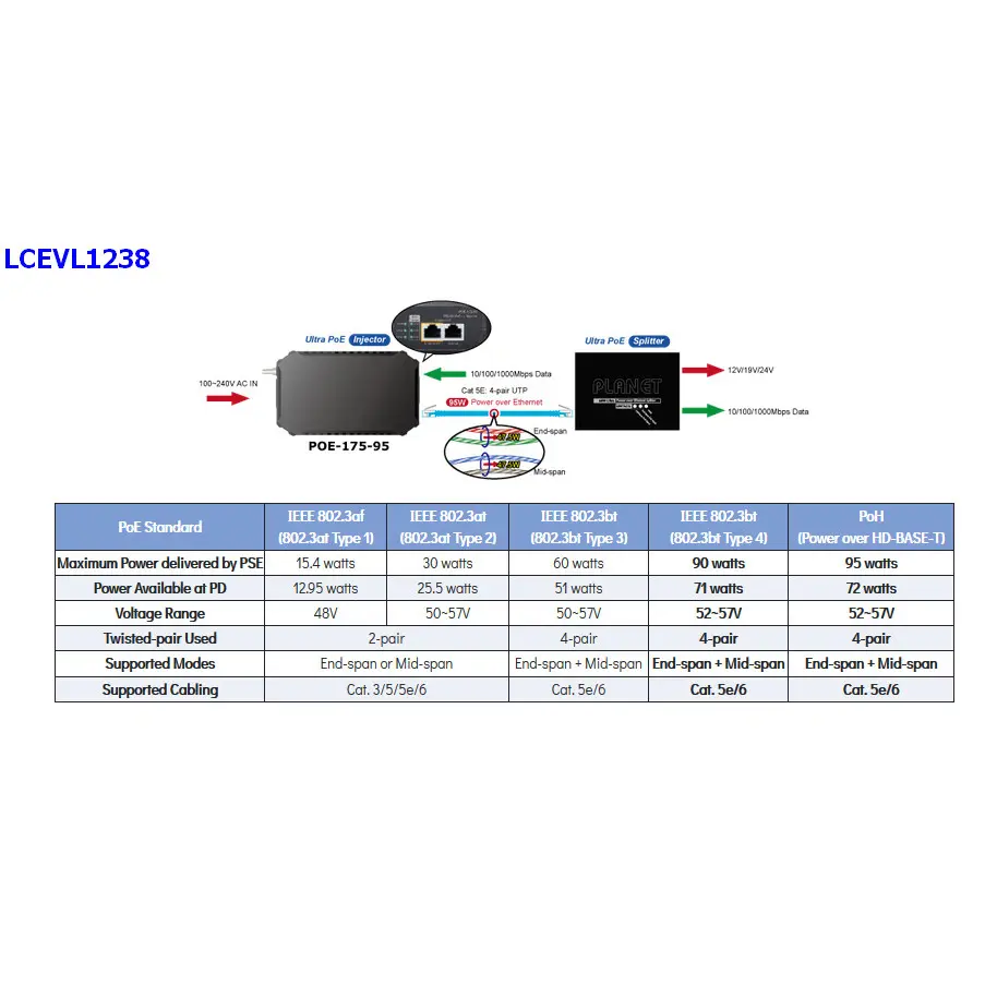 100-240ac>UltraPOE 95W-802.3bt-at Gb LAN Single-Port 10/100/1000Mbps 802.3bt PoE++ Injector Advanced 802.3bt PoE Network Solution PLANET POE-175-95 is a Single-Port, 802.3bt Power over Ethernet Injector with a maximum of up to 95 watts of power output over Ethernet cables.