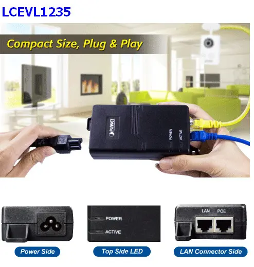 PLANET POE-163 Gigabit POE - 53Vdc out IEEE802.3at High Power PoE+ Gigabit Ethernet Injector - 30W (All-in-one Pack) The POE-163 is a wall-mountable, single-port Gigabit 802.3at PoE+ injector with internal power supply in compact housing.