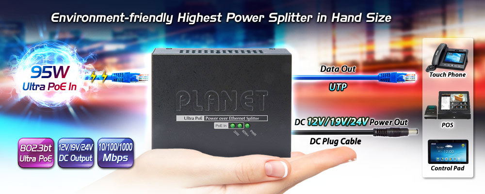 PLANET POE-172S Gigabit ultra Power over Ethernet splitter, meeting the IEEE 802.3at/af standard with 802.3bt ready, delivers the Ethernet digital data and ultra PoE power over the twisted-pair cables to network devices. It separates the digital data and the power into three optional outputs (12V/19V/24V DC) and supports a transmission distance of up to 100 meters.