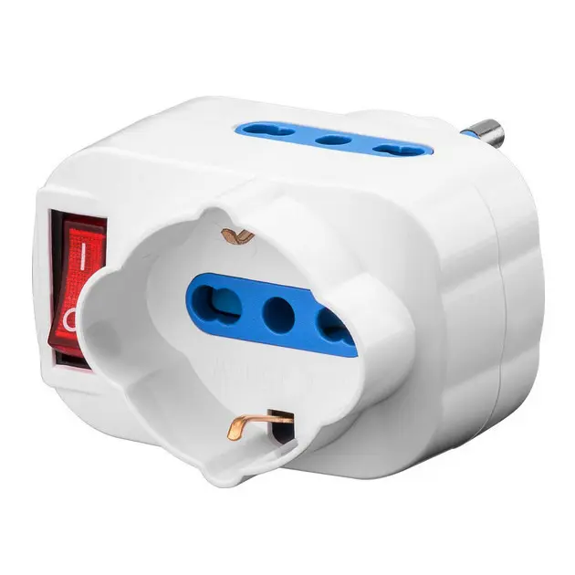 CON 2 PRESE BIPASSO 10/16A +INTERRUTTORE Adattatore presa tripla 10/16A + Standard Tedesco SCHUKO -> spina 16A rotante, con interruttore luminoso per il collegamento di max. 5 dispositivi elettrici adattatore con interruttore ON/OFF illuminato spina girevole (90°) + adattatore USB spina girevole (90°) tipo L 16 A, 2 prese tipo L 10/16 A 1 presa tipo L 10/16 A + protezione contro contatti accidentali