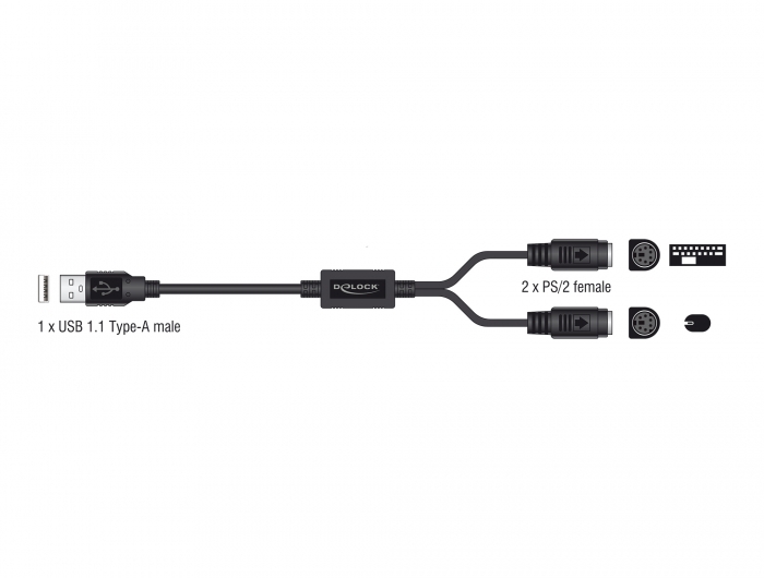 L'adattatore USB Delock consente il funzionamento di un mouse PS/2 e una tastiera PS/2 tramite la porta USB di un PC o computer portatile.