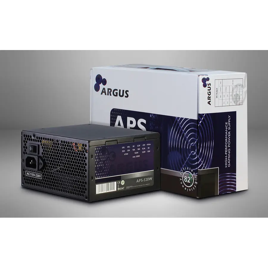 115/230Vac SILENT80+ ACTIVE PFC EPS12V Power supply Argus APS-520W -- PCI-Express 6+2Pin -- EPS12V 4+4 pin -- Mainboard 20+4Pin ACTIVE PFC - EFFICIENZA >82% -- Noise Level 19-21dB -- Over Voltage Protection OVP -- Short Circuit Protection SCP -- Over Power Protection OPP -- Under Voltage Protection UVP - Over Shoot OS Ventola 120mm -- 86 x 150 x 140mm 1,2Kg --
