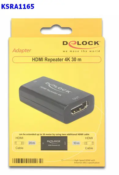 This Delock HDMI repeater can be used for signal enhancement of your HDMI connection up to 30 m. Thereby you can plug in an up to 20 m long cable from your PC or laptop to the input port of the repeater. On the other side you can plug in an up to 10 m long cable to the output port of the repeater which will be connected to your display or TV. The repeater supports a resolution up to Ultra HD (4K) and is backward compatible to Full-HD 1080p.
