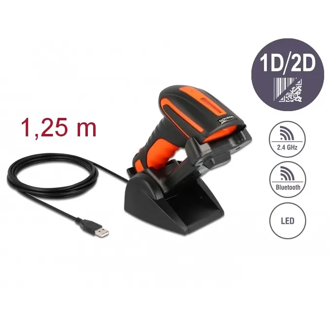 INDUSTRIALE 1D/2D BT+2.4GHz BASE KIT USB Delock Scanner industriale di codici a barre 1D e 2D per 2,4 GHz o Bluetooth con stazione di ricarica induttiva Questo scanner per codici a barre Delock può essere collegato in modalità wireless a un PC, a un portatile o direttamente a un cellulare o a un tablet. Tutti i tipi di codici a barre 1D e 2D più comuni possono essere acquisiti con precisione anche a una notevole distanza. Inoltre, lo scanner riconosce i codici a barre sui display e sui monitor.