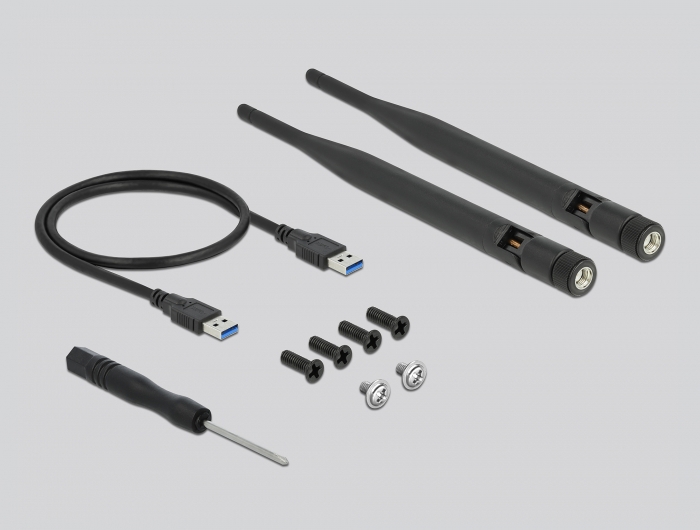 Robusta custodia in metallo con connettore d'antenna La robusta custodia impedisce, ad esempio, di danneggiare il modulo M.2 incorporato quando viene utilizzato in movimento. I due connettori per antenna SMA e le antenne in dotazione possono essere utilizzati per ricevere un segnale radio, ad esempio LTE, o per utilizzare un'antenna per 2,4 GHz e un'antenna per 5 GHz quando si utilizza un modulo WiFi.