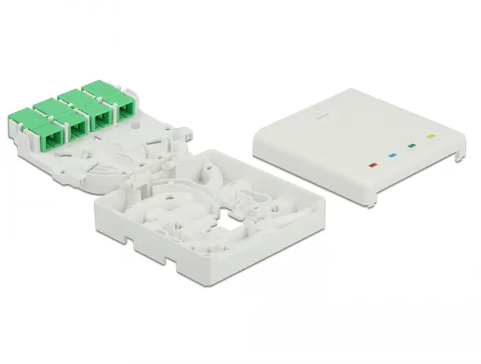 • Scatola di connessione in fibra ottica • 4 x attacco SC Simplex con protezione laser per capovolgimento • 4 x Tubo termoretraibile • 2 x viti • 2 x tassello