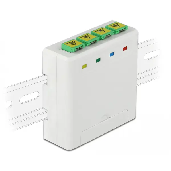 • Scatola di connessione in fibra ottica per applicazioni FTTH • 4 slot per attacchi SC Simplex o LC Duplex • Montaggio su guida DIN: 35 mm • Montaggio a parete: 2 x fori di montaggio Diametro foro di montaggio: 7 mm Passo del foro per vite: circa 60 mm • Coperchio con inserto per etichetta • Capovolgimento protettivo • Colore: bianco • Materiale: ABS • Dimensioni (LxPxA): ca. 80 x 80 x 29 mm